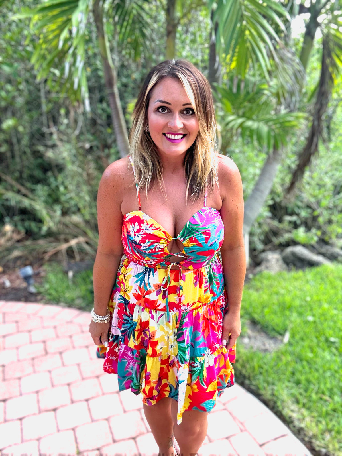 Turn every sidewalk into your personal runway with the Fiesta Fling Dress—a playful burst of color that screams tropical getaway. With its ruched bust, flirty front tie, and breezy tiered skirt, this mini is made for beachside brunches, festival fun, or golden hour twirls. The bold floral print brings the vacation vibes wherever you go.