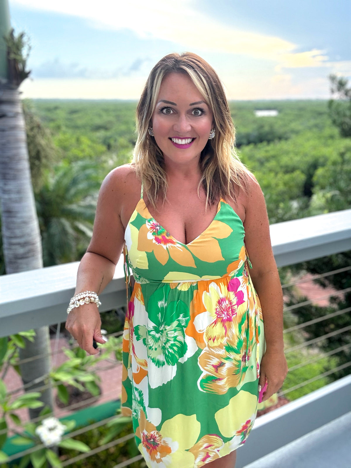 Step into your island era with the Lush Island Mini—a flirty burst of florals in rich tropical greens, golden yellows, and soft pinks. Lightweight and breezy, this dress features a flowy silhouette with delicate spaghetti straps and side ties for the perfect relaxed fit. Whether you're beach bound or brunching, this is your go-to for effortless vacay glam.