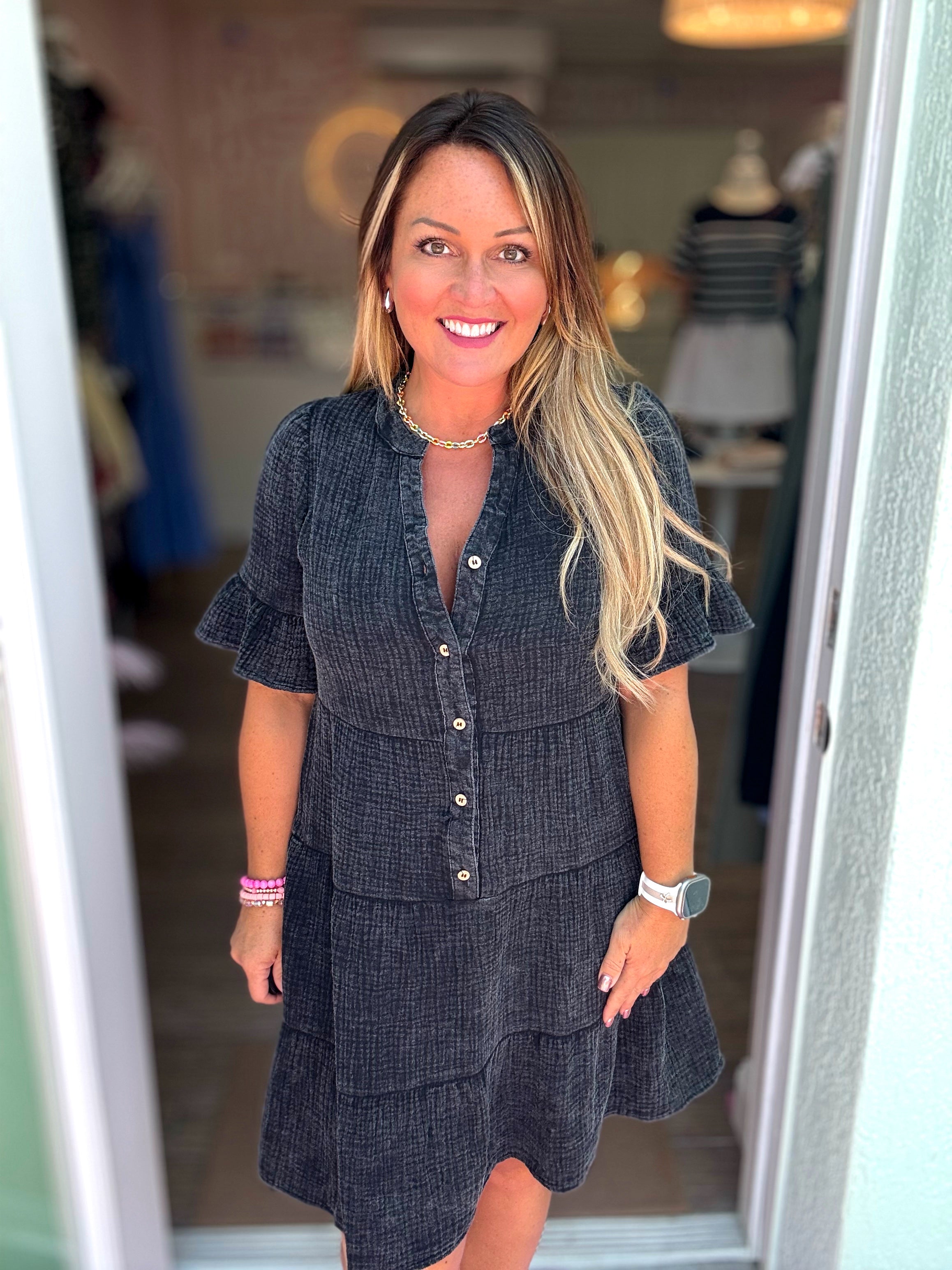 Effortlessly chic with a touch of edge, this button-front mini is your go-to for both day and night. Featuring flutter sleeves and a flowy silhouette, it’s flirty, comfortable, and endlessly versatile — the perfect little black dress with a dreamy twist.