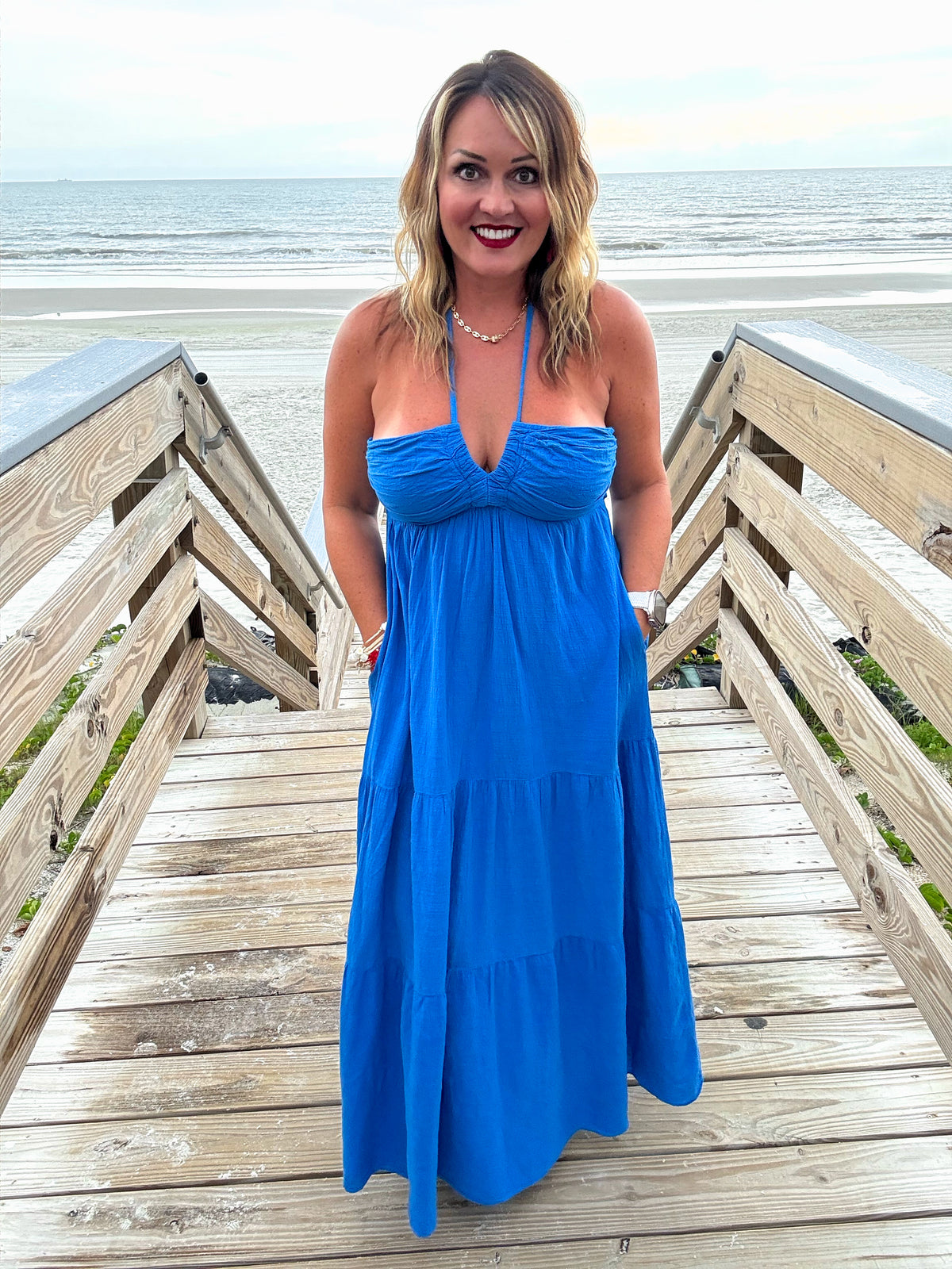 This beachy beauty channels breezy boardwalk vibes with its vibrant cobalt or black hue, halter neckline, and flowy tiers—perfect for sunset strolls or seaside sips. This dress is made from a high quality natural cotton fabric. This maxi dress features an open back, halter tie at neck, and tie closure at back. The perfect piece for brunch!