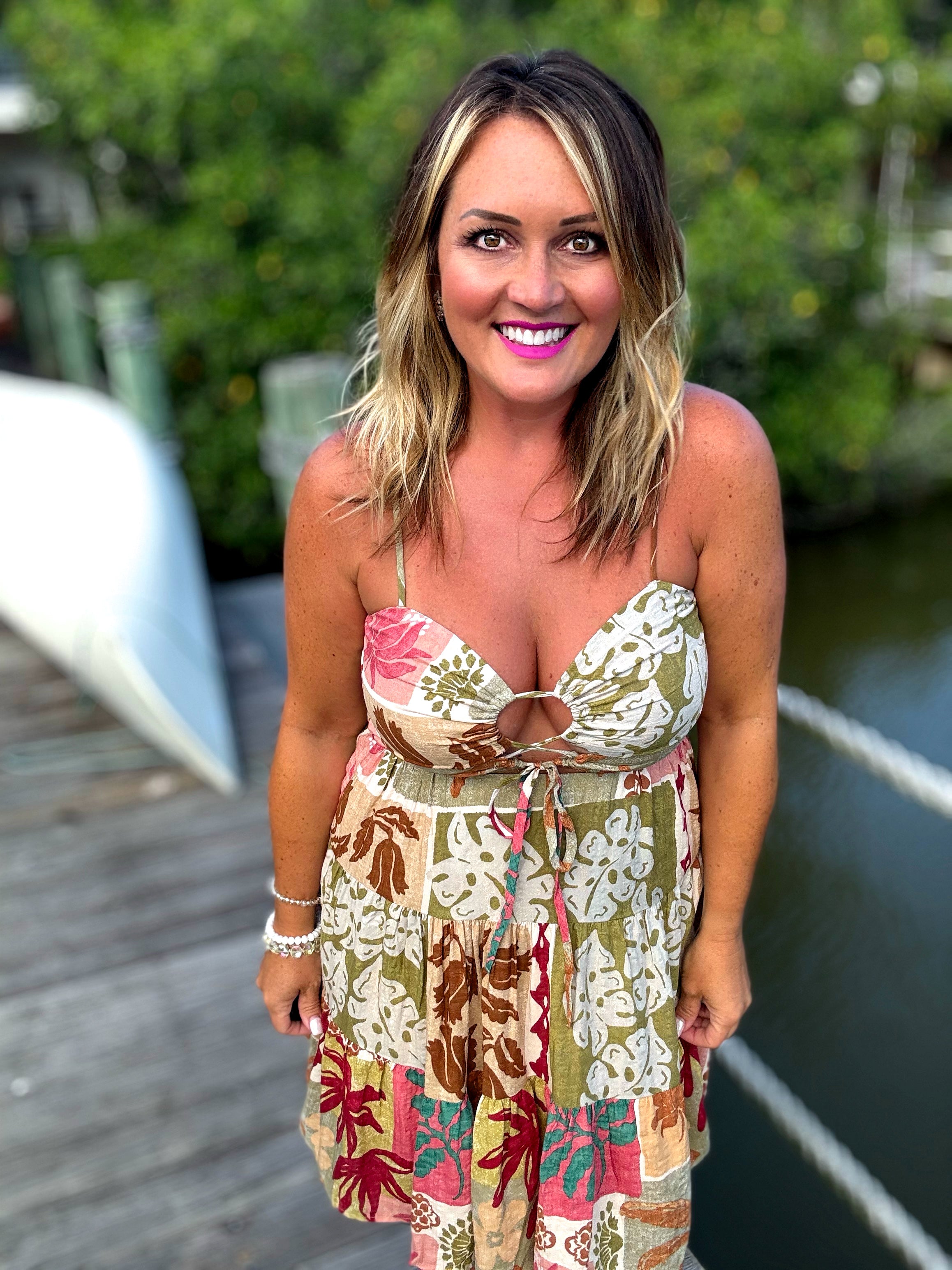 Escape to paradise in this boho-beautiful patchwork dress, where every square tells a story. With a mix of earthy florals, soft tiers, and a flattering ruched front tie, this lightweight piece moves with you-from golden hour strolls to weekend markets. Adjustable straps and breezy comfort make it a dreamy must-have for your warm-weather wardrobe.