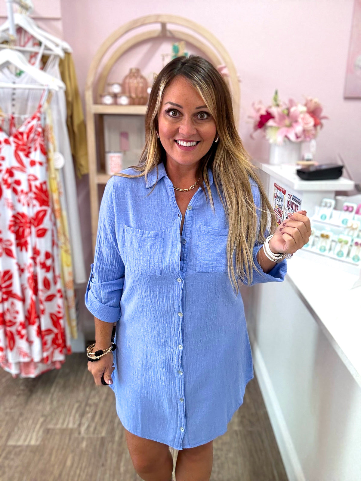 Easy, breezy, and oh-so-flirty, this button-front shirt dress is your ticket to effortless coastal chic. Lightweight gauze keeps you cool, roll-tab sleeves add laid-back charm, and the relaxed fit makes it perfect for tossing over a swimsuit or styling with sandals for dockside drinks.
