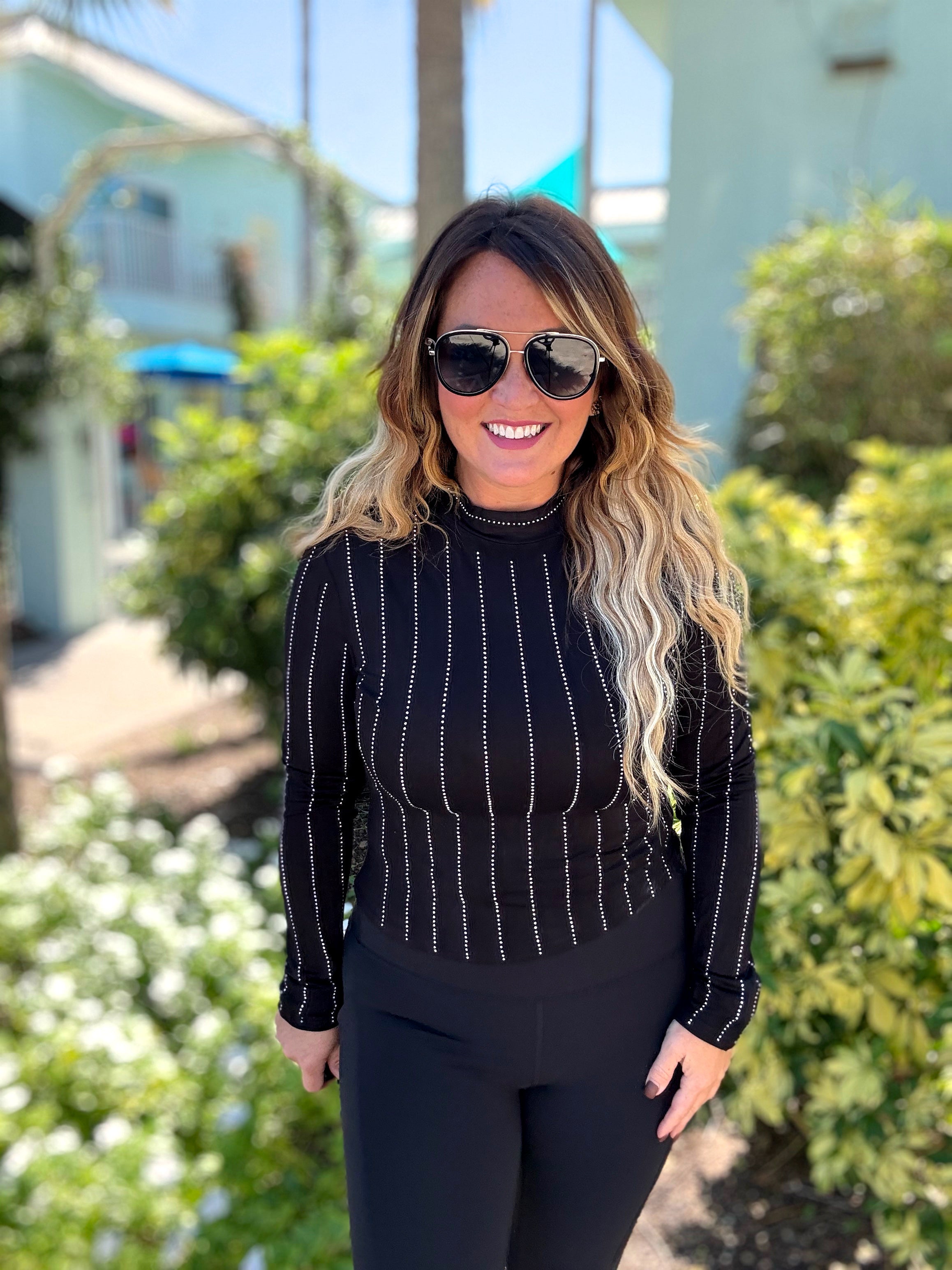 Rev up your wardrobe with a little edge and a lot of sparkle. This sleek black top is decked out in vertical rhinestone detailing that catches the light with every move — whether you’re cruising the boulevard or heading out for cocktails. The soft stretch fit hugs just right, keeping you comfy while serving major biker-glam vibes.