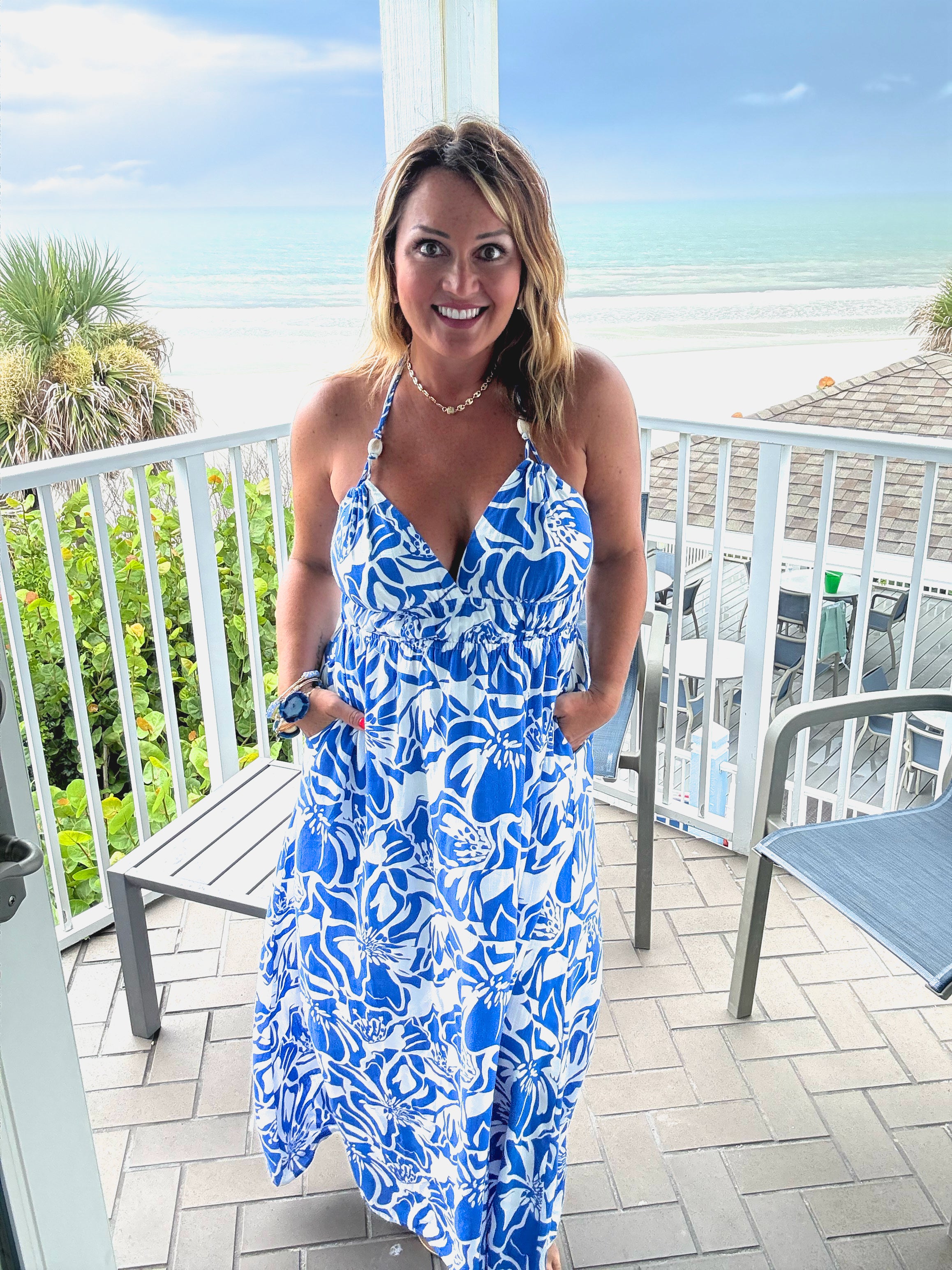 Catch coastal feels in the Blue Tide Bloom Maxi — a halter-style stunner with bold cobalt florals, pockets for your seaside essentials, and all the vacay vibes you can handle. Whether you’re sipping spritzes or strolling the shore, this dress is your breezy, beachy bestie.