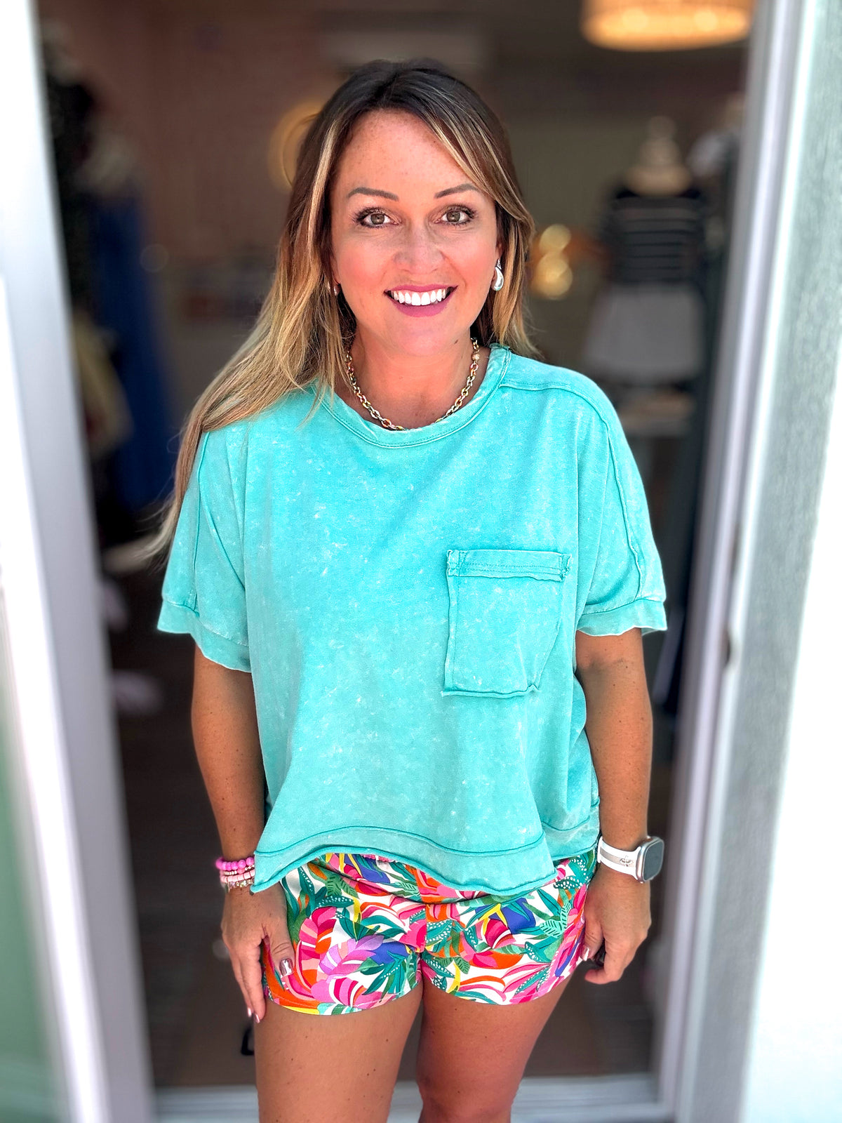 Mineral Washed Oversized Crop Comfy Knit Top - Casual Comfy Spring Wardrobe Essential Style For Game Day - Basic Essential Washed Soft Knit Crop Top - Washed Soft Knit Top with Dolman Sleeve - Key Item of 90"s Activewear Fashion - Pink Girly Top Easy to Style with Casual Fit - Drop Shoulder - Short Sleeve - Patch Pocket - Round Neck