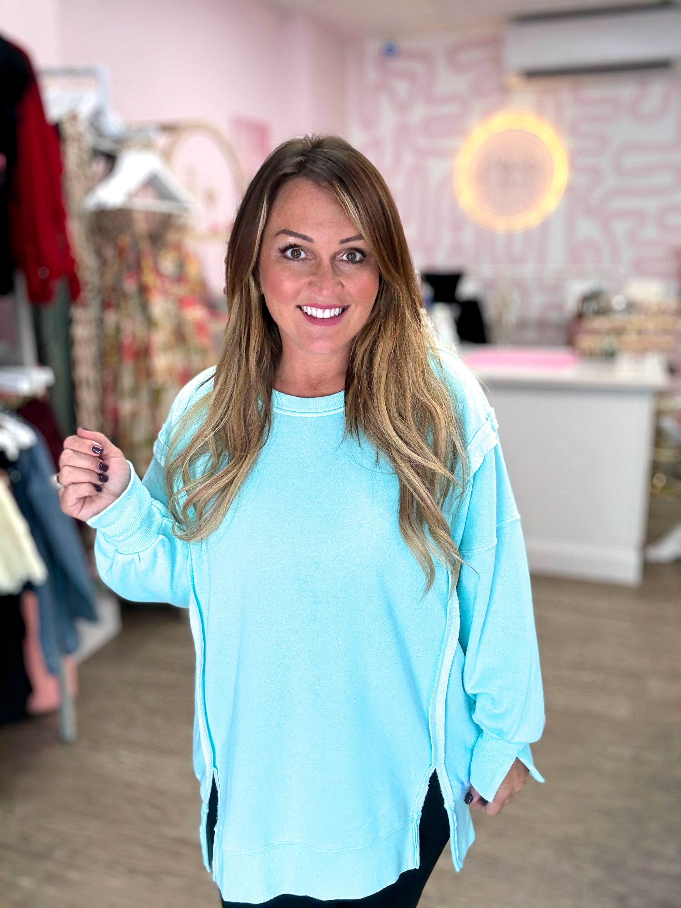 We spared no attention to detail in our sweatshirt! This forever timeless pullover is a slouchy, relaxed fit with exposed seaming, cute split cuff hem and ribbed trim detail! Has super soft "sweatshirt" feel on the inside!